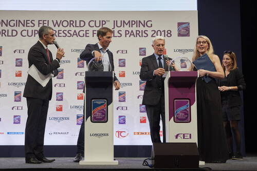 FEI PRESS RELEASEParis (FRA), 11 April 2018Photo caption: Sweden’s Henrik von Eckermann (left) and French star Roger Yves Bost (right) pictured at the draw for starting order of the Longines FEI World Cup™ Jumping Final in Paris (FRA) tonight. Hosts for the night were Yannick Bichon (far left) and Alison Drummond (far right).