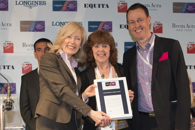 Photo caption: FEI Director of Press Relations Grania Willis presents Mayvor Thorin, press officer for the Gothenburg Horse Show, with the award for the Best Press Office of the Longines FEI World Cup™ Jumping Western European League 2013/2014 at the Longines FEI World Cup™ Jumping Final today in Lyon (FRA). (Photo: Dirk Caremans/FEI.)