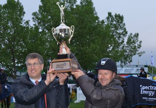 Photo by © Spruce Meadows Media Services. Eric Lamaze raises his second trophy in a row.